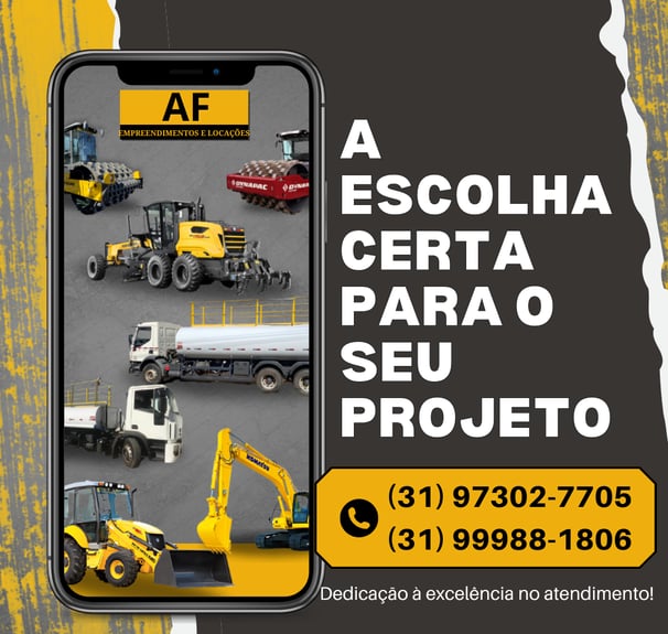 A AF Locações apresenta as melhores máquinas para o seu projeto. Retroescavadeira, motoniveladora, rolo compactador, escavadeira e muito mais. Entre em contato agora!